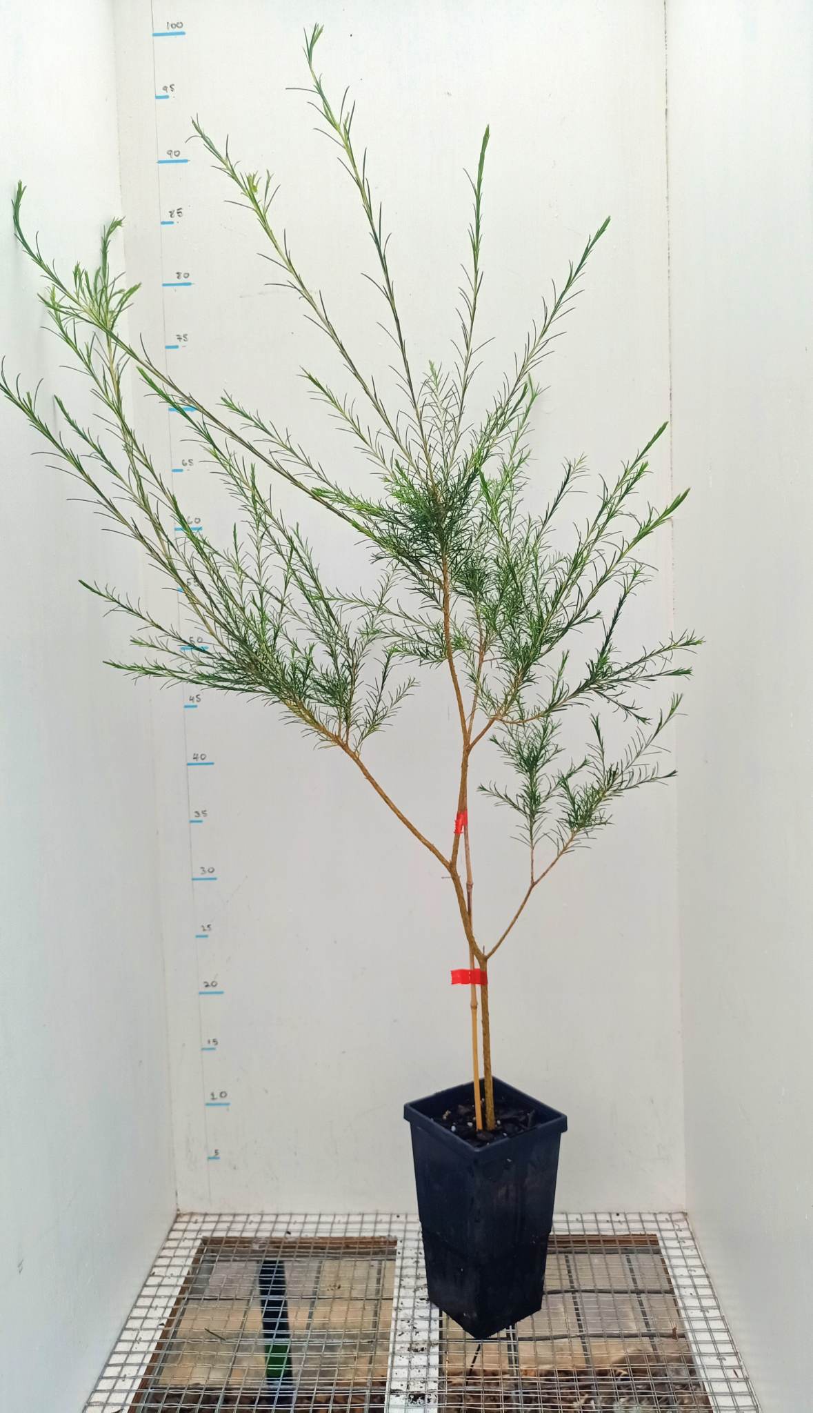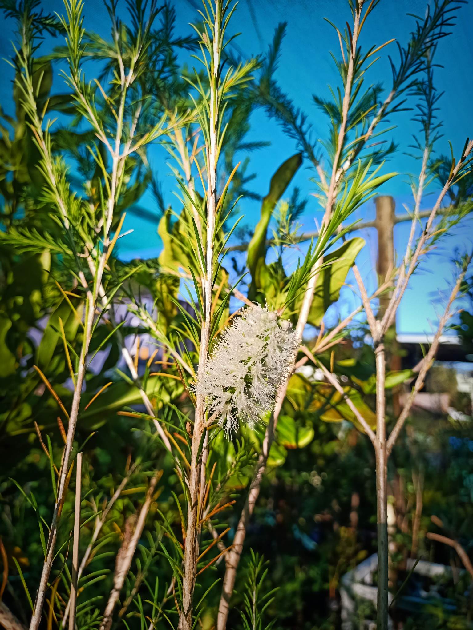 Description: Bracelet Honey Myrtle is a small to medium-sized tree or shrub that can grow up to 4 meters in height. It has a dense, bushy growth habit with fine, needle-like leaves that are about 10-20mm long. The flowers are creamy-white, bottlebrush-like, and appear in summer to autumn. The bark is smooth and pale grey, and as the tree matures, it develops a distinctive mottled, peeling bark.