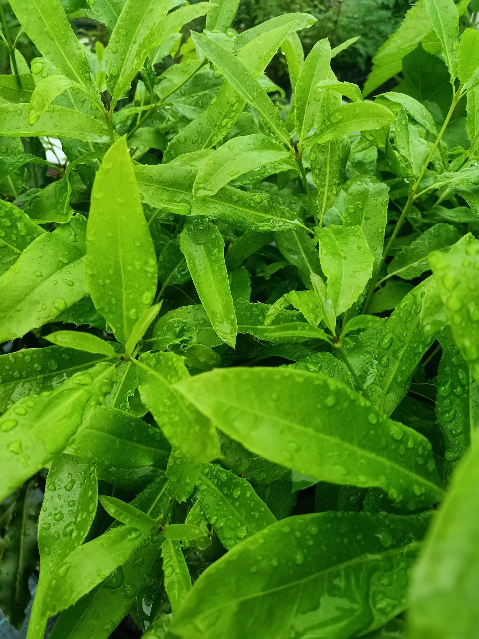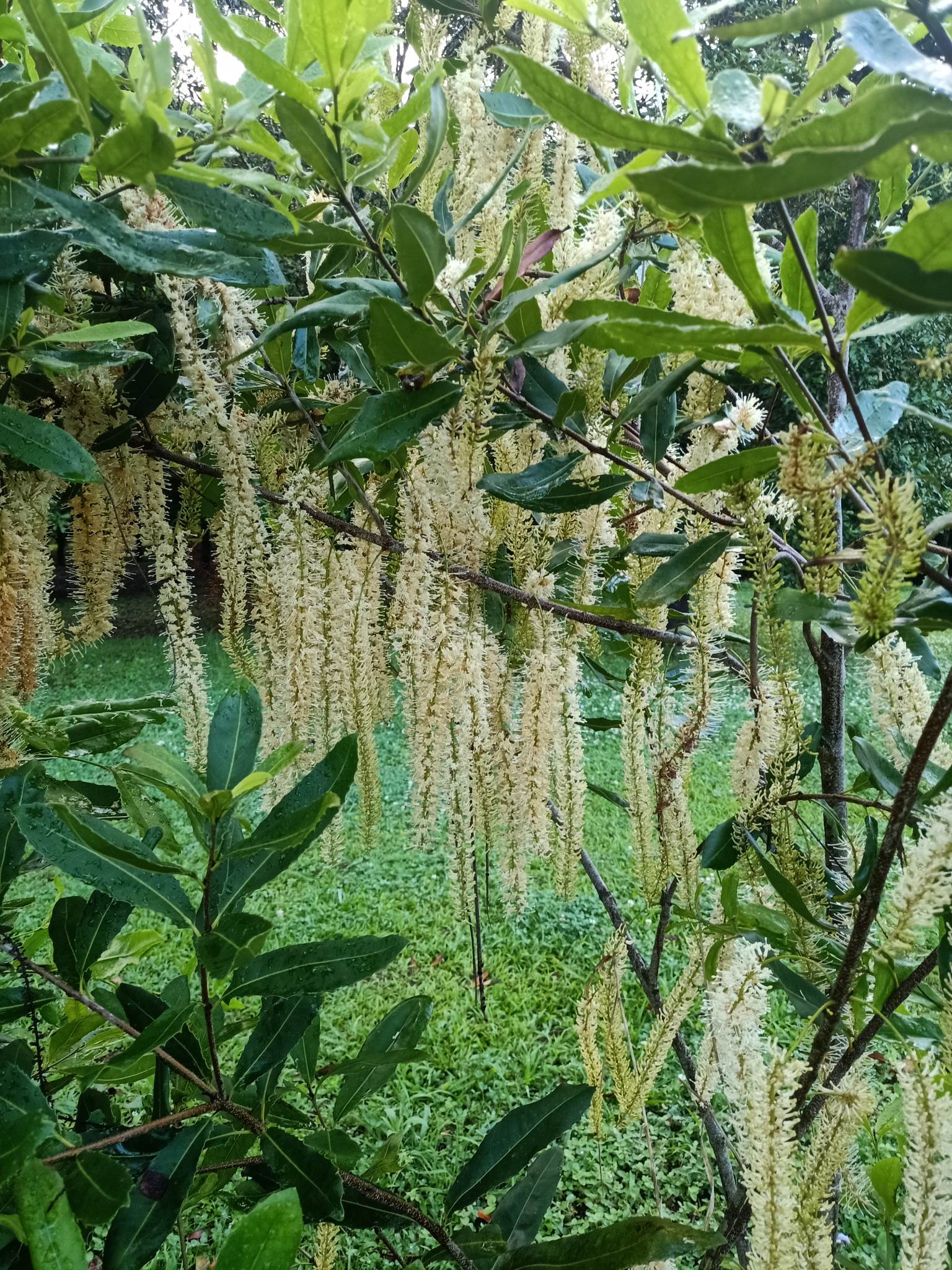 Description: The Macadamia tree is a medium-sized evergreen tree that typically grows up to 8-15 meters tall and 5 -12 meters wide. It has dense foliage with dark green, glossy leaves that grow up to 10-30 centimeters long.