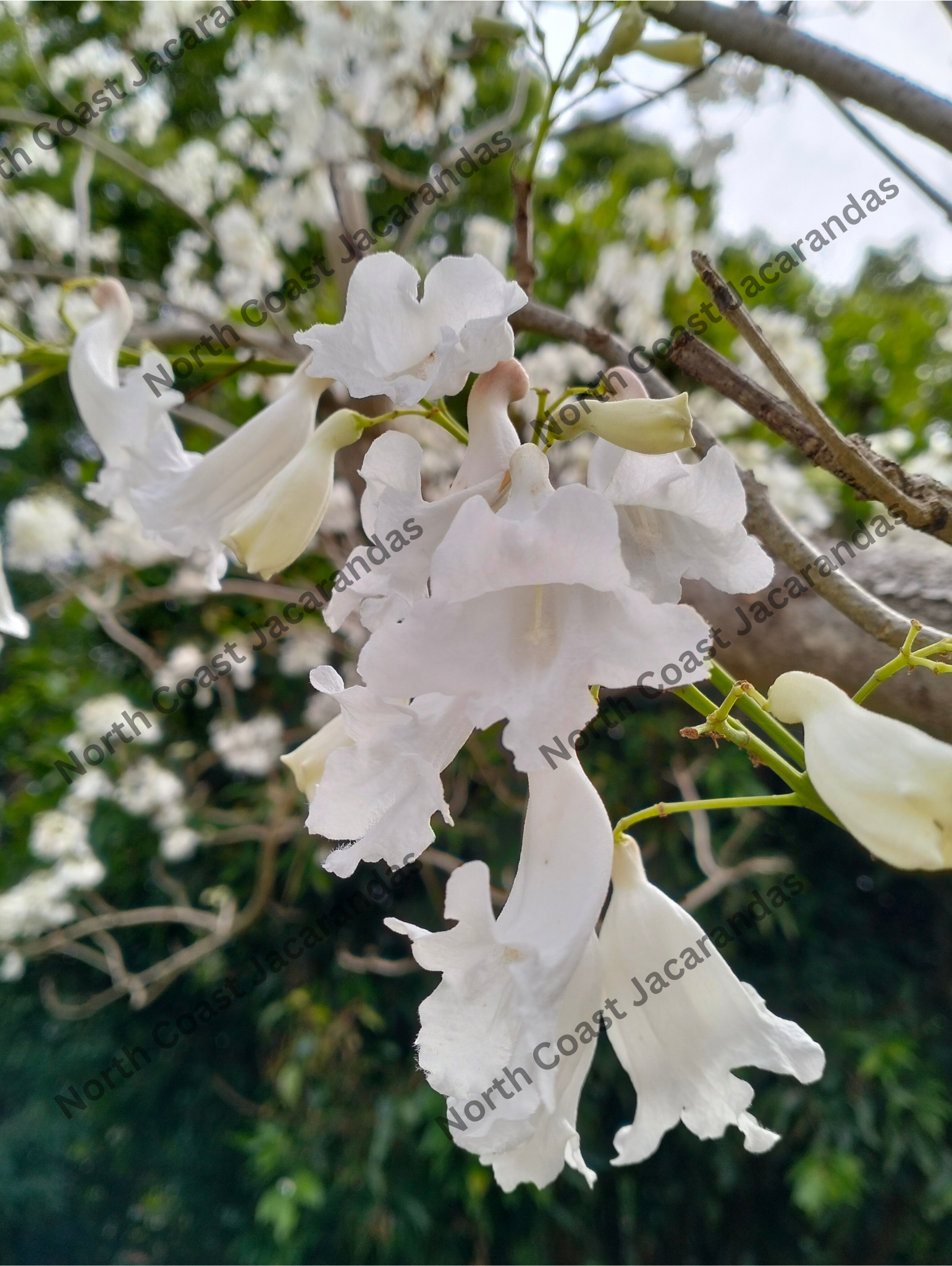 Please be careful of growers that are selling UNGRAFTED and/or SEED GROWN WHITE JACARANDAS. The seed from white jacarandas is sterile and will no grow, or in the off chance it does grow. The flower colour will revert back to purple. The gene that carries the white flowering trait does not pass on via the seed embryo. True white jacarandas can only be propagated by grafting.
