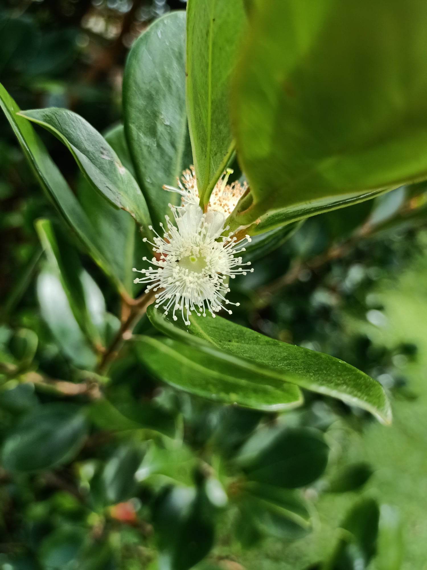 The tree has a dense canopy of glossy, dark green leaves, which are oval-shaped and about 5-10cm (2-4 inches) in length. The Lemon Guava produces fragrant, white flowers that are about 2cm (0.8 inches) in diameter, which develop into small, round fruit that are about the size of a golf ball.