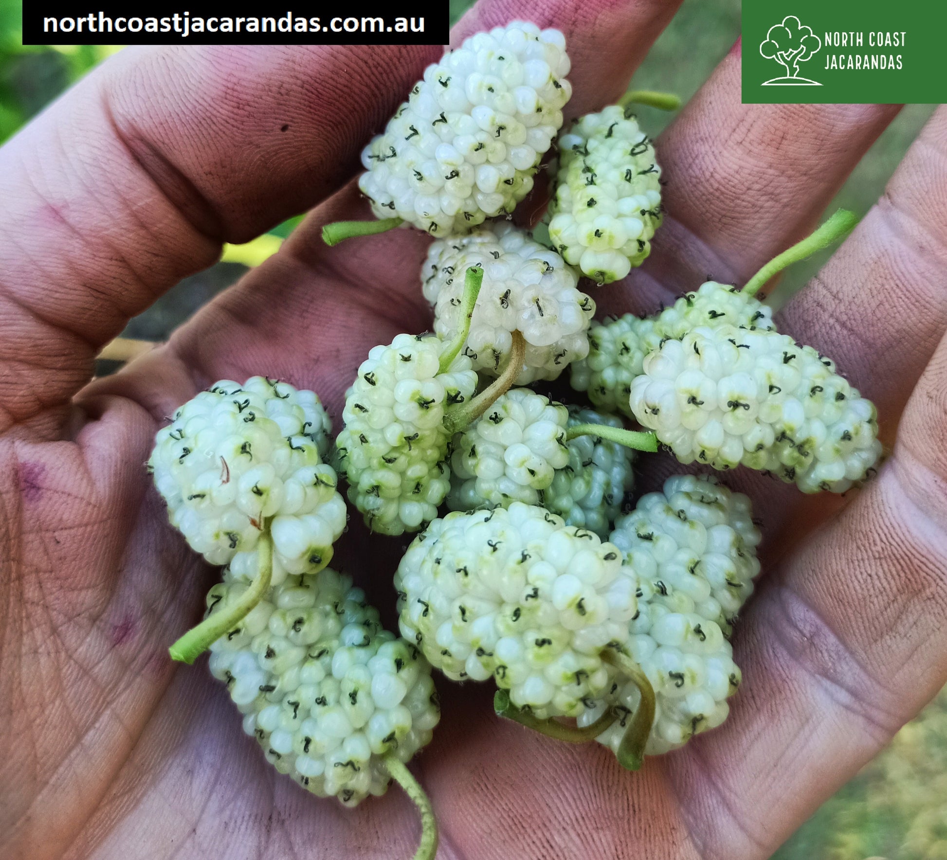 Description: The White Mulberry tree is a deciduous tree that can grow up to 9 meters tall with a spread of 9 meters wide. It has a rounded canopy with a moderate growth rate, reaching a height of 3-5m in just a few years. The leaves of the White Mulberry are glossy green, heart-shaped and grow up to 13cm long.